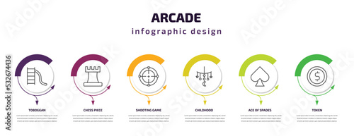 arcade infographic template with icons and 6 step or option. arcade icons such as toboggan, chess piece, shooting game, childhood, ace of spades, token vector. can be used for banner, info graph,