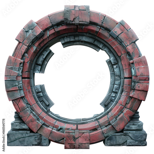 Arched stone portal with weathered red and gray bricks, isolated on white. Ancient and mysterious structure.