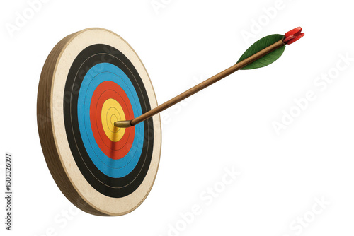 Archery arrow hitting the center of colorful target on a transparent background, perfect for concepts related to business, achievement, and precision