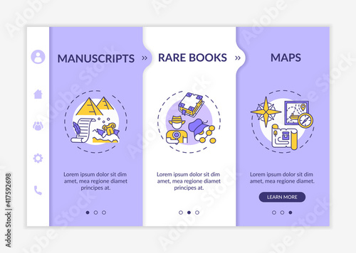 Archinve collections onboarding vector template. Online library benefits. Access to first editions. Responsive mobile website with icons. Webpage walkthrough step screens. RGB color concept