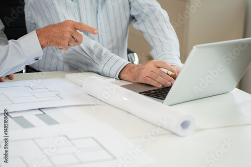 architect caucasian working on table use drawing tool on the paper plan for business architectural project..