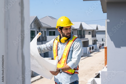Architect in yellow helmets reviewing blueprints at a construction site.