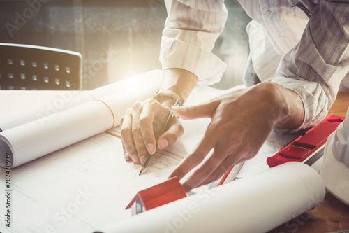 Architect or engineer working in office with blueprints,engineer inspection in workplace for architectural plan,sketching a construction project ,selective focus,Business construction concept.