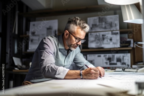 Architect working on drawing table in office. Architect working on blueprint at office.