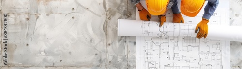 Architects and builders reviewing plans together, construction site, illustrating project cohesion and unified vision