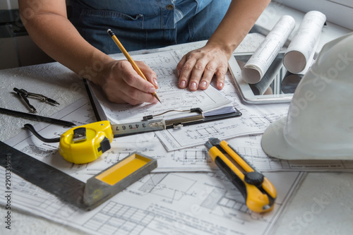Architects concept, engineer architect designer freelance work on start-up project drawing, construction plan. architect design working drawing sketch plans blueprints and making construction model
