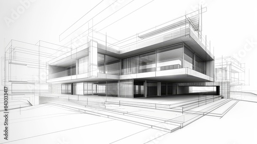 Architectural blueprint of a modern residential building, wireframe lines merging with realistic house models, abstract and detailed