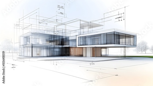 Architectural blueprint or rendering of a contemporary residential building with a minimalist geometric facade design featuring glass concrete and wood elements