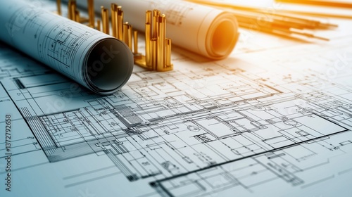 Architectural blueprint or technical drawing on a desk with various engineering tools and equipment including pencils rulers compasses and a scale