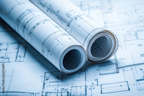 Architectural blueprints rolled up on a table showcasing detailed technical drawings and plans