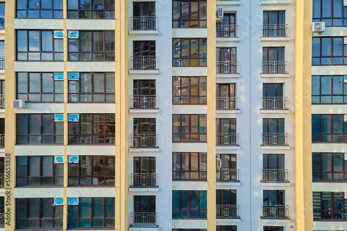 Architectural details of modern high apartment building facade with many windows and balconies