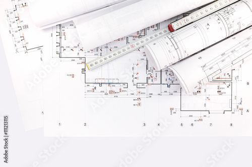 architectural drawings, rolls of blueprints with ruler