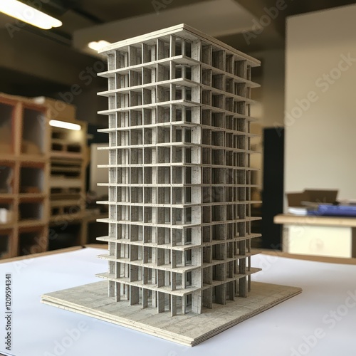 Architectural model of a modern building showcasing minimalist design in a workshop