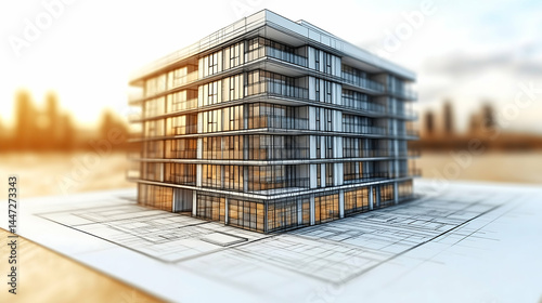Architectural model of a modern multi-story building rests on blueprints showcasing its design against a blurred citysc