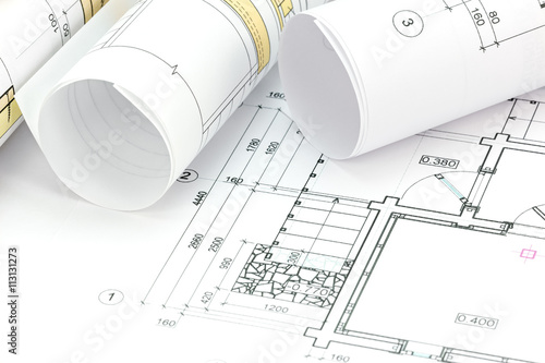 architectural project, technical drawing, blueprint rolls on pla
