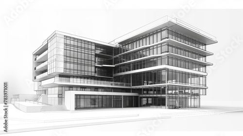 Architectural rendering of a contemporary apartment building with balconies and trees in a monochromatic scheme.