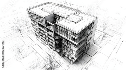 Architectural sketch of a building plan or house design, featuring a 3D drawing or blueprint illustration for a construction project concept