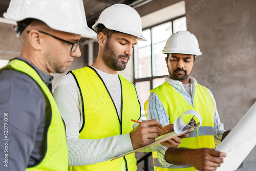 architecture, construction business and people concept - male architects in helmets with clipboard discussing blueprint in office building