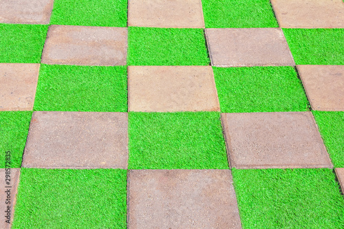 Architecture of Square concrete block and green grass in green zen garden. Chequered Grass. Outdoor park pattern Background.