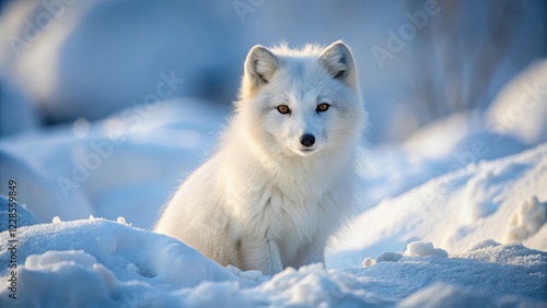 Arctic Fox in snowy terrain with fur fluffed up against cold, cold weather, wildlife, cold weather, wildlife