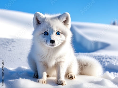 Arctic fox with striking blue eyes resting in a snowy landscape under clear skies