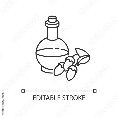 Argan oil pixel perfect linear icon. Natural cosmetic product for haircare treatment. Thin line customizable illustration. Contour symbol. Vector isolated outline drawing. Editable stroke