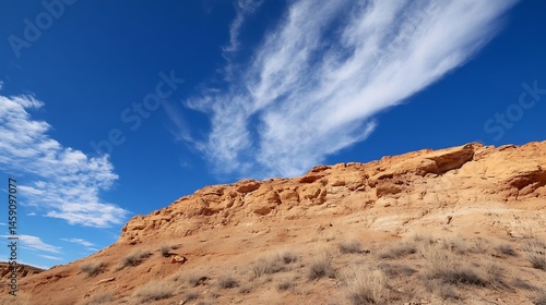 Arid landscape featuring a dramatic sandstone cliff face under a vibrant blue sky with wispy white clouds, showcasing the textures and colors of the desert environment. : Generative AI