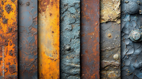 arious metal textures with rust and patina arranged vertically, highlighting a spectrum of colors and corrosion patterns, symbolizing the passage of time and natural decay