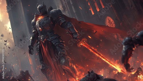 Armored warrior wielding a flaming sword in a dark fantasy setting Video Game. AI generated image