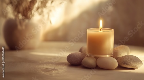 Aroma candle on beige background. Warm aesthetic composition with stones. Cozy home comfort, relaxation and wellness concept. Interior decoration mockup, 8k image