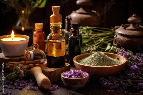 Aromatherapy room with medicinal herbs and essential oils. Created using generative AI tools