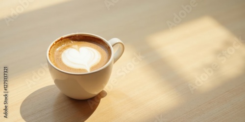 Aromatic Coffee Drink in a White Mug, Basking in Sunlight on a Light Wooden Table