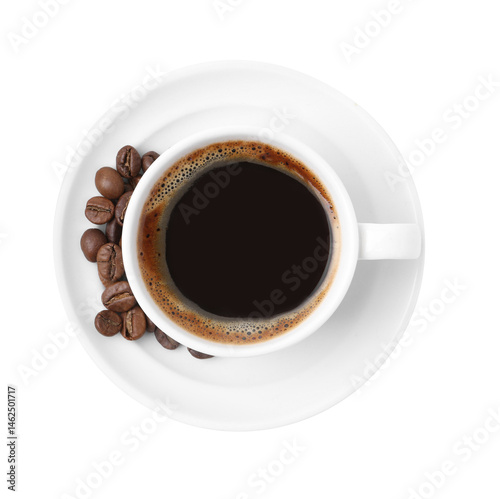Aromatic coffee in cup, beans and saucer isolated on white, top view