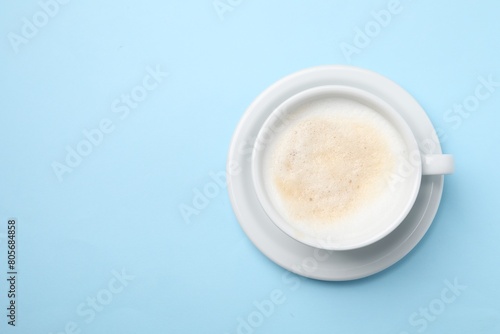 Aromatic coffee in cup on light blue background, top view. Space for text