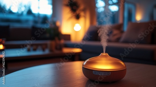 aromatic harmony an essential oil diffuser emitting a calming mist in a softly lit room evokes feelings of relaxation and well being promoting a sense of tranquility and inner peace