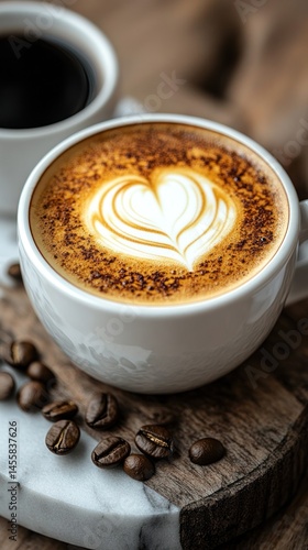 Aromatic latte art, heart design atop a warm beverage, alongside a dark coffee