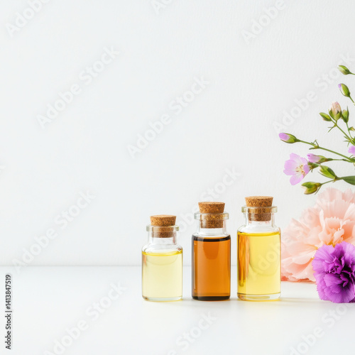 Aromatic oils small glass bottles with cork stoppers are displayed alongside delicate flowers, creating serene and calming atmosphere. warm colors of oils complement soft floral hues