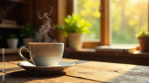 Aromatic Steam Rising from a Warm Mug on a Rustic Wooden Table near a Sunlit Window