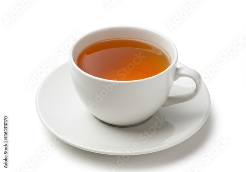 Aromatic tea in a white cup and saucer on a white background with soft lighting