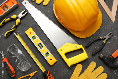 Arrangement of different construction tools and hardhat on black grunge background
