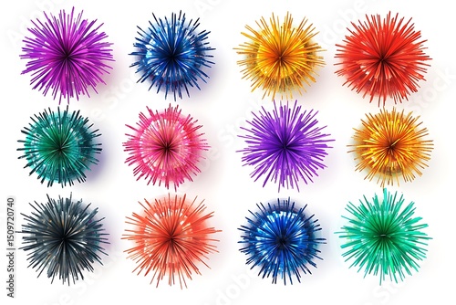 Arrangement of twelve colorful spiky balls on a white surface in a grid pattern overhead shot