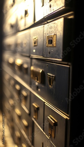 Array of Metallic Safe Banks Deposited Along Each Row with Vault Doors and Lock Security System