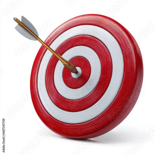 Arrow hitting the bullseye on a red and white target isolated on white background
