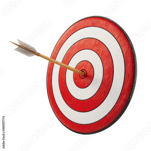 Arrow hitting the center of target. An arrow with a wooden shaft and white feathers perfectly placed in the bullseye of the target. The arrow is positioned diagonally and the target is red and white.