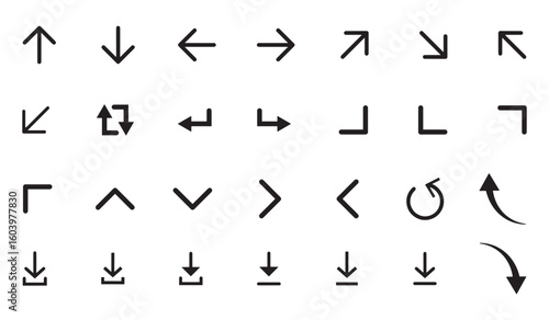 Arrow Icon Grid. 30 Directional Symbols Including Curved, Straight, and Corner Designs for UI Navigation, Diagrams, and Digital Interfaces.