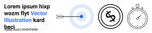 Arrow strikes center of target, dollar coin icon conveys financial focus, stopwatch shows time management. Ideal for business, goals, finance, time, accuracy success. Abstract line flat metaphor