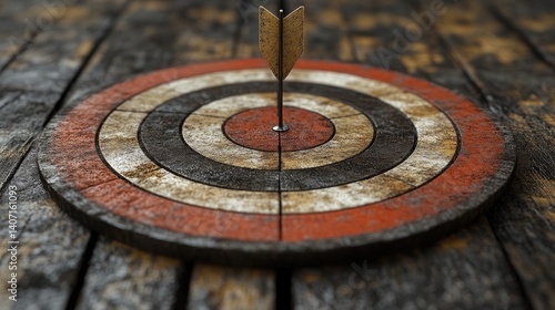 Arrow strikes worn target on aged wooden planks, centered with rings in black, white, and red