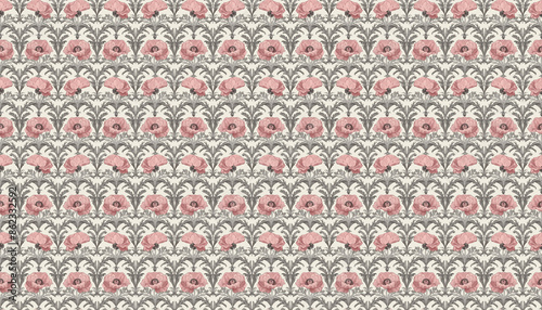 Art nouveau pattern with pastel pink poppy flowers, on a light gray color background
