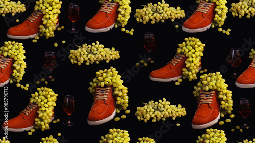 Art pattern combining grapes and men's shoes.