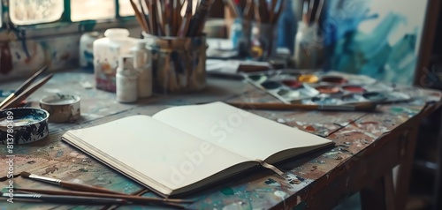 Art supplies and a blank canvas on a wooden table in an art studio.